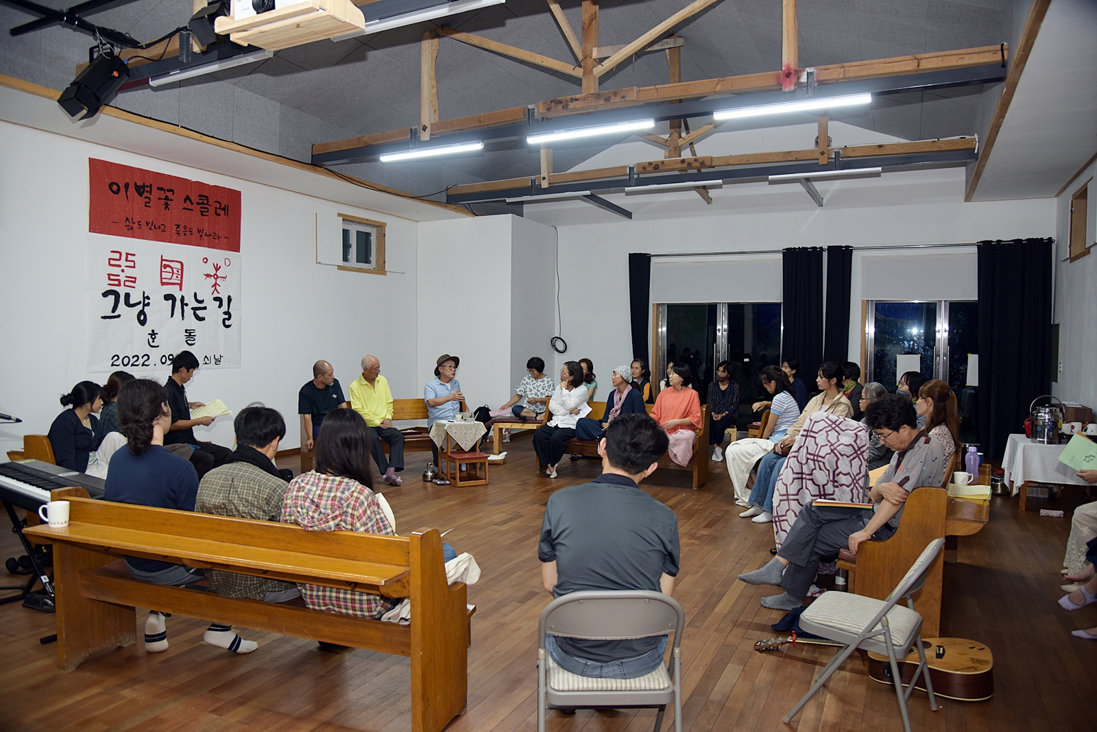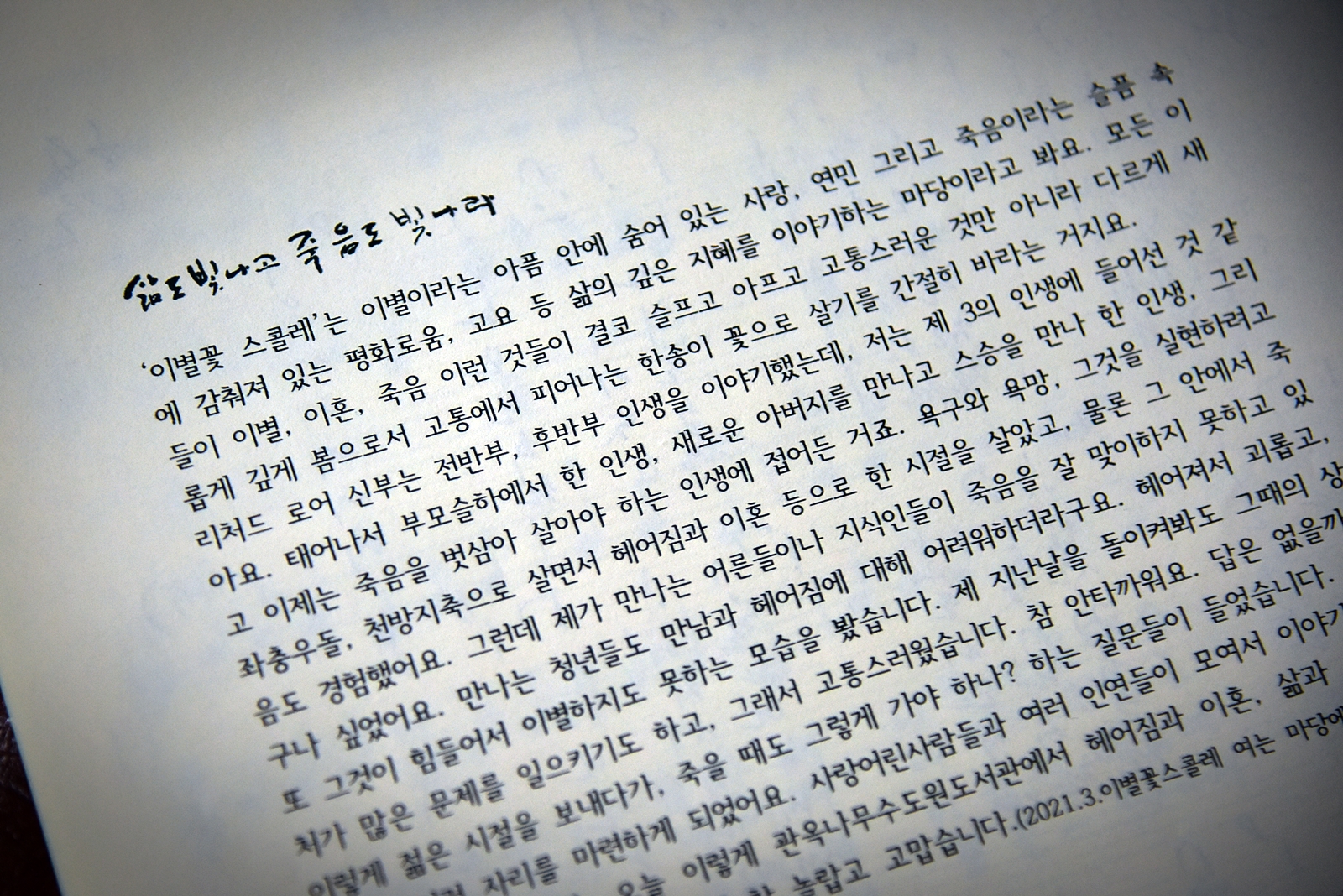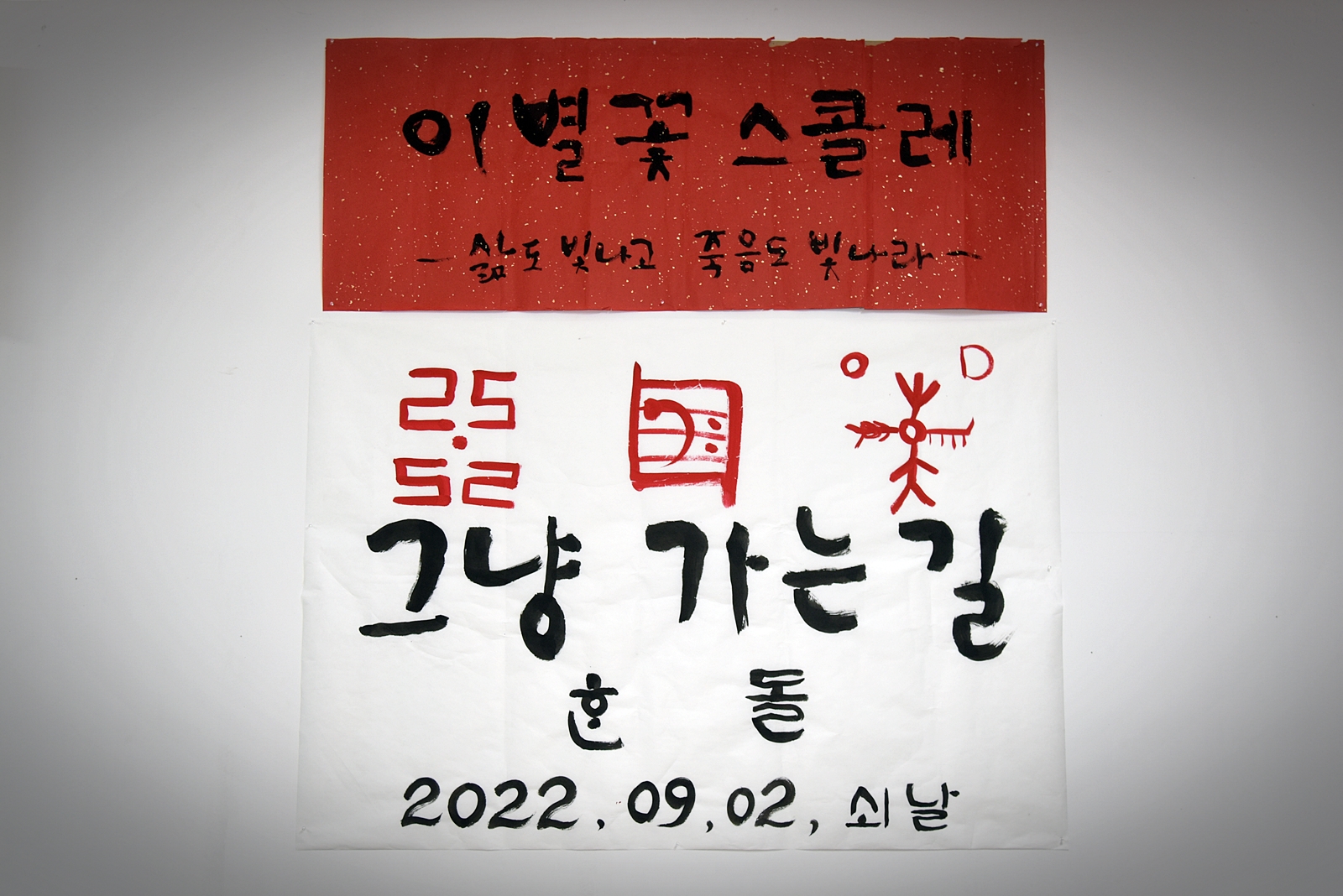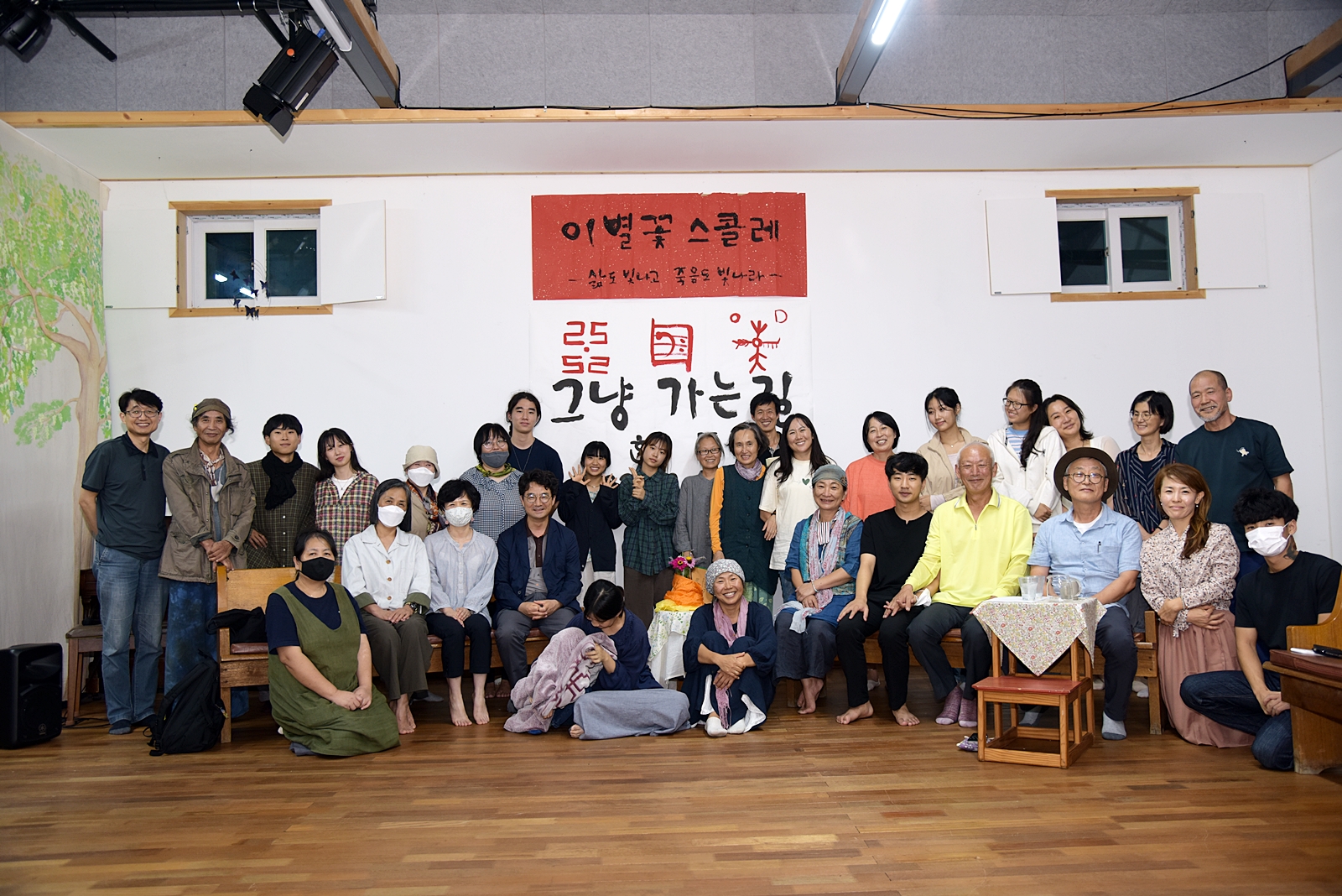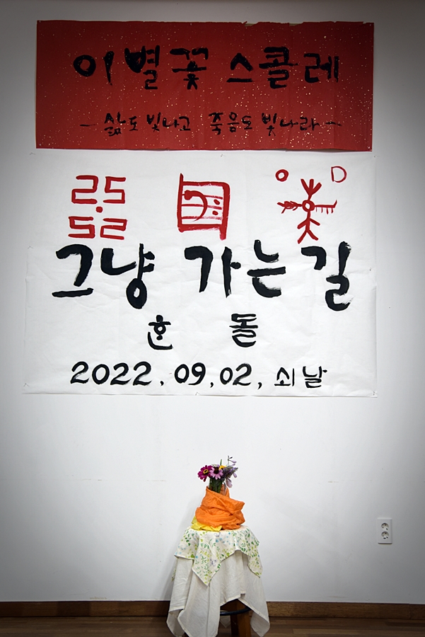 그래서 다음에 펼쳐지는 이별꼬스콜레도 많이 기대해 주시면 좋겠어요. 다음 9월 30일에는 죽은 자를 위한 산자들의 노래를 부르고 계시는, 굿판에 계시는 박필수 선생님을 모시고 그분만의 이별꽃스콜레, 그분과 우리들이 어우러지는 이별꽃스콜레를 펼쳐갈 예정이거든요. 기억하셨다가 꼭 함께해 주시기를 바라고요. 오늘 다 이렇게 함께해 주셔서 너무 고맙습니다.