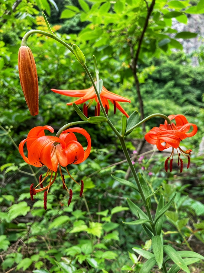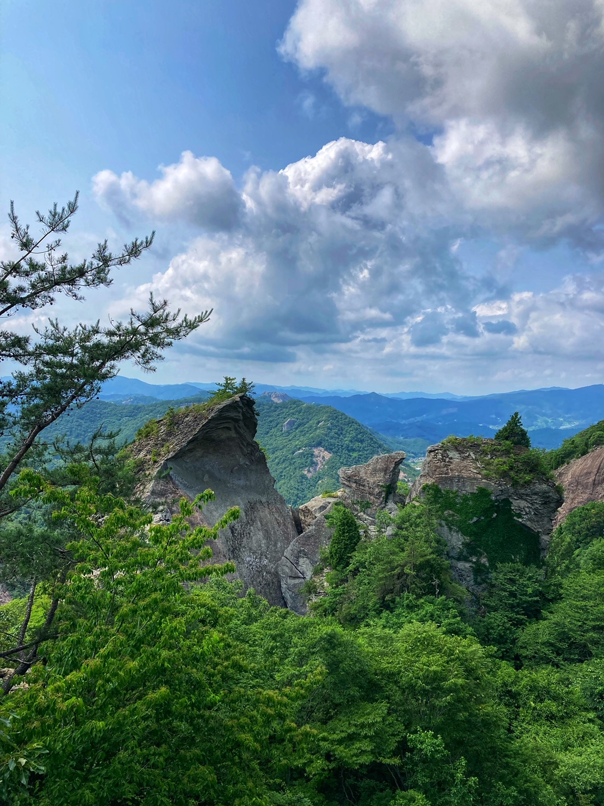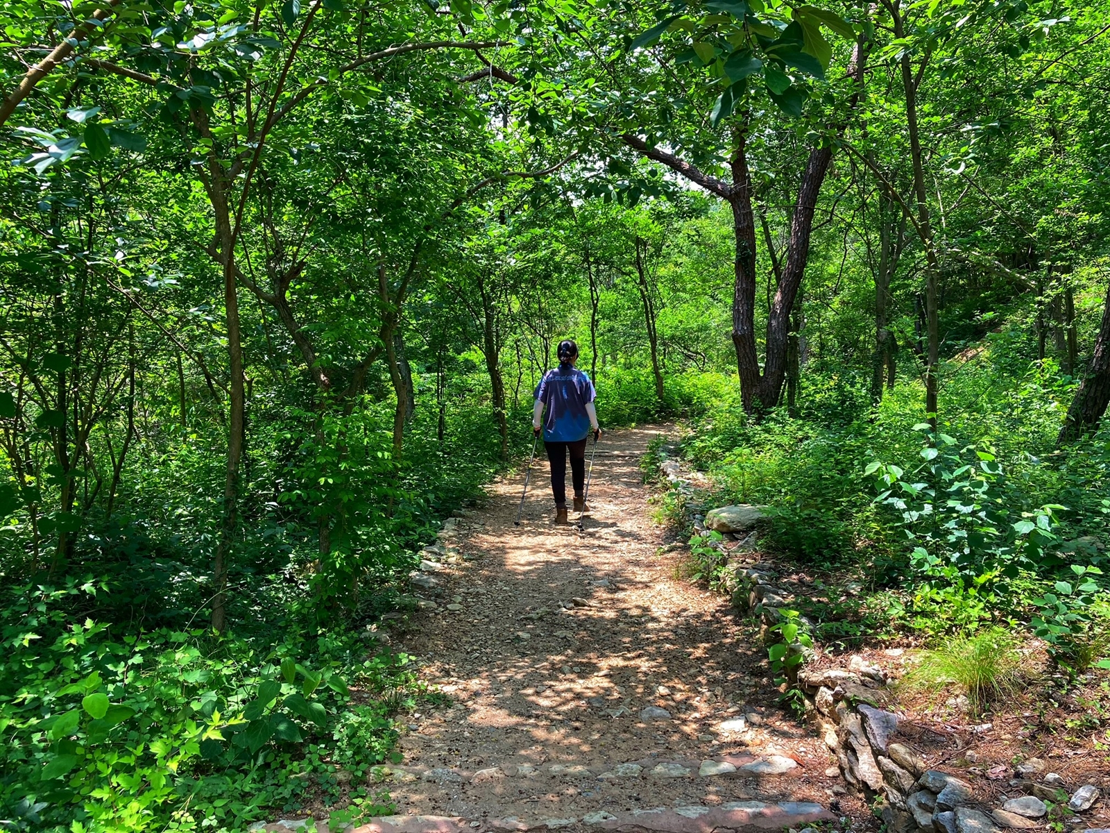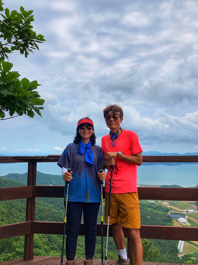 우리는 참으로 오랜만에 산에 올르는 터라 가장 짧은 코스를 선택했다. 어제 캠핑 짐을 쌀 때 등산 스틱과 신발을 준비했다. 스틱은 여러 가지로 등산을 하는 데에 도움을 준다. 산에 갈 때면 꼭 챙긴다. 주차장에서 곧바로 정상으로 올랐다가 능선을 타고 다시 주차장으로 돌아오는 코스로 정했고 대략 2시간 반이 걸린다고 했다. 주차장에서 곧바로 정상으로 가는 바람에 줄곧 오르막을 마주해야 했다. 이마에 땀이 주렁주렁 맺혀서 떨어졌고, 우리는 자주 쉬었다. 하늘은 높았고, 구름은 유유자적했고, 햇살은 한여름을 방불케했지만 숲에 들었을 때 나무 그늘은 선선했고, 때때로 불어오는 바람은 시원했다.
